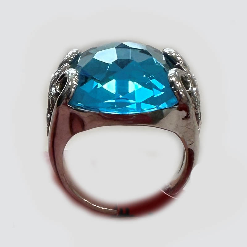 Beautiful silver “scrolls” on both sides of the blue topaz
